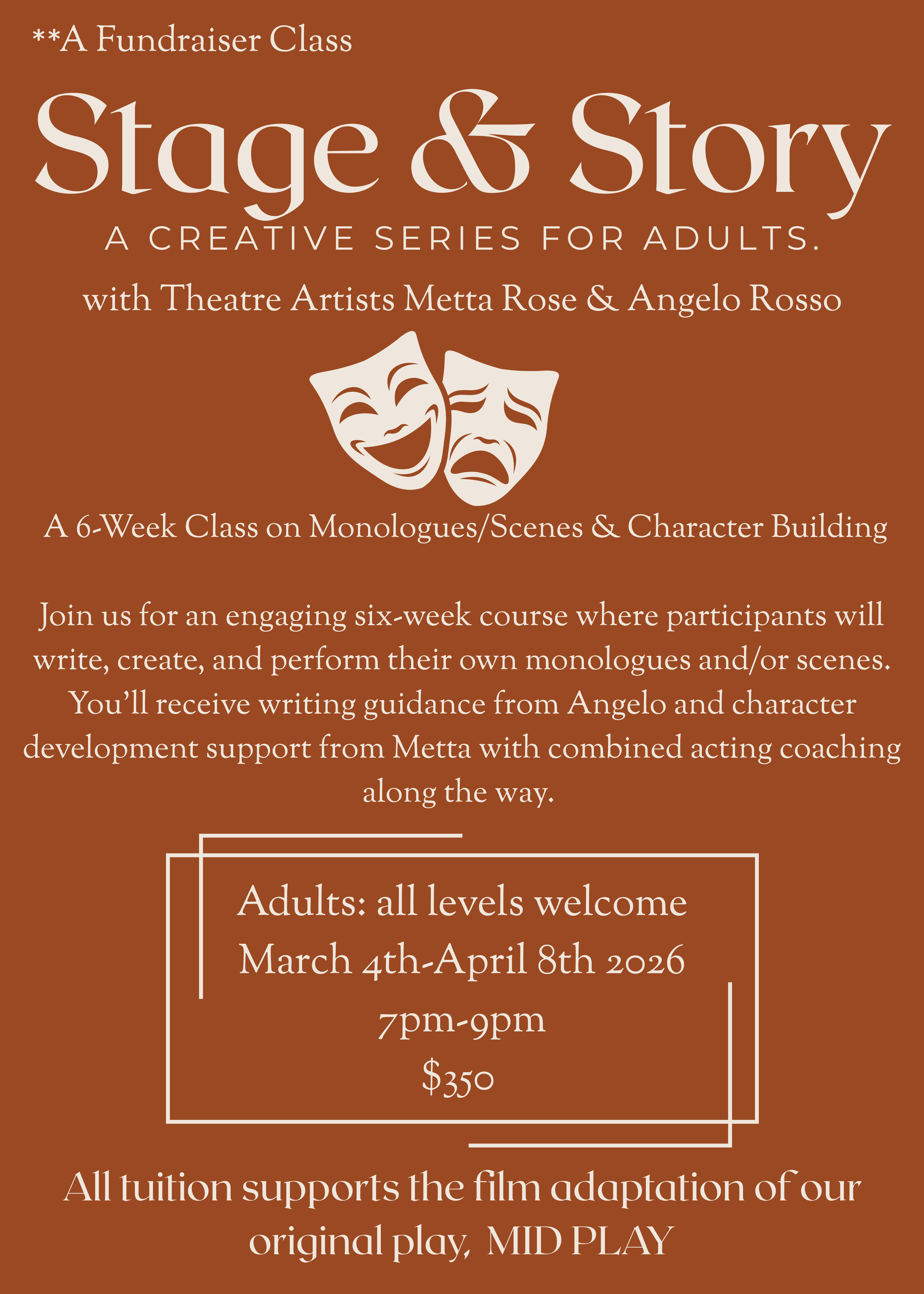 From the creative team that brought you MID PLAY. Join Metta Rose & Angelo Rosso for an engaging six-week course where participants will write, create, and perform their own monologues and/or scenes.